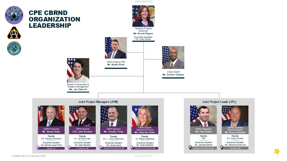 The CPE CBRND is one of the four components of the Chemical and Biological Defense Program, led by the Deputy Assistant Secretary of Defense for Chemical and Biological Defense. While CPE CBRND receives guidance and oversight from the Deputy Assistant Secretary of Defense for Chemical and Biological Defense, the organization’s acquisition authority comes from the Assistant Secretary of the Army for Acquisition, Logistics, and Technology (ASA(ALT)).
